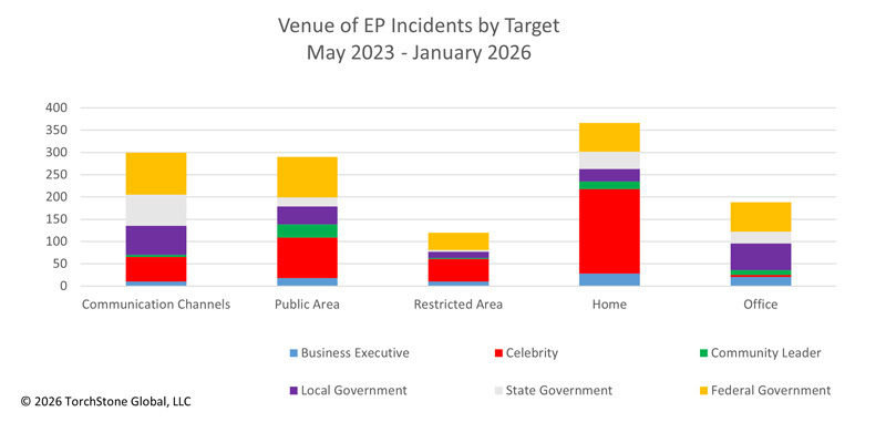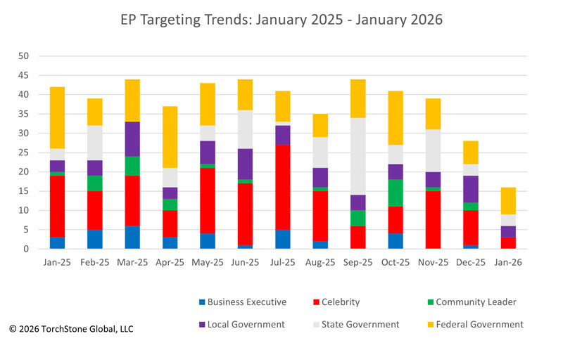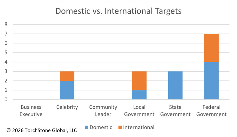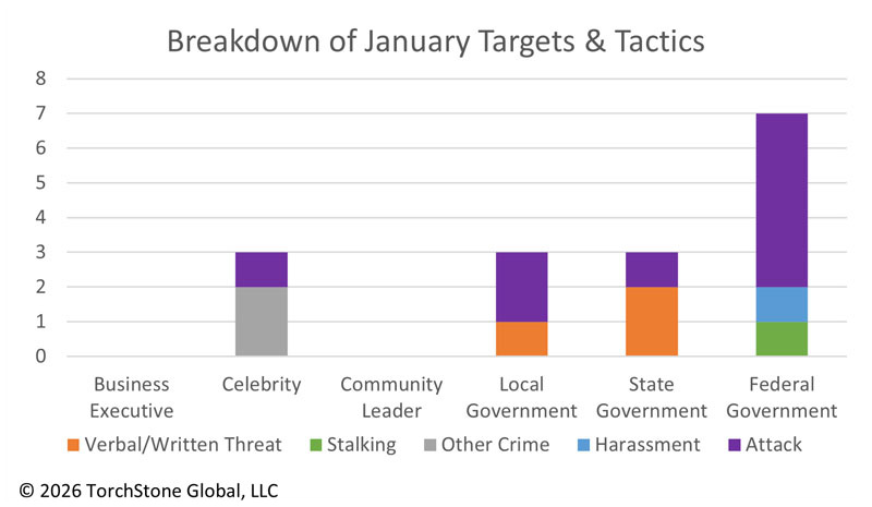 - Violence targeting state-level officials continued in January, with the most egregious case involving an armed attack against an Indiana judge and his wife. The attacker lured the couple to their home’s front door by claiming that he had their dog and then shot them both through the door. Both the judge and his wife survived the attack. The incident is reminiscent of the June 2025 targeting of Minnesota state lawmakers, when the shooter posed as a police officer to lure the victims into an attack and another attempted attack. While the Indiana shooting appears to be linked to an individual facing violent crime charges who was scheduled to appear in the judge’s court days after the attack, the incident may have been influenced by the rising violent sentiment against state-level officials. In addition to the June 2025 attacks in Minnesota, TorchStone has tracked at least 13 incidents of threatening communications and harassment targeting Indiana state lawmakers since November 2025. While those threats stemmed from political debate over congressional redistricting, they contributed to an overall increase in hostility towards state-level officials. Environments of increased public threats and hostility can influence violent individuals and justify their actions, even if the motives differ.