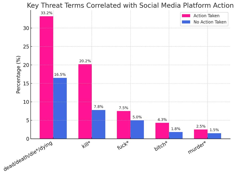 The table below lists the threat terms present in reported social media posts, alongside the rate of action taken (removed or restricted) versus no action taken by social media platforms.